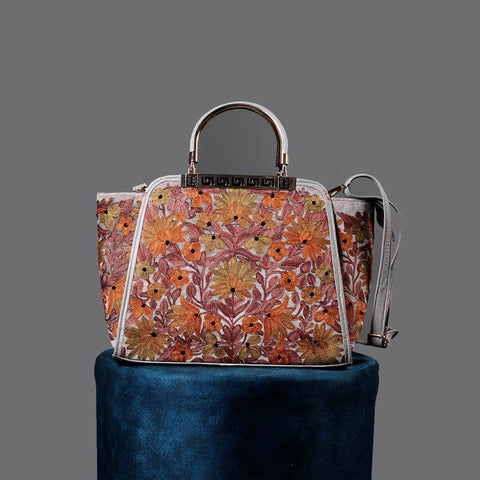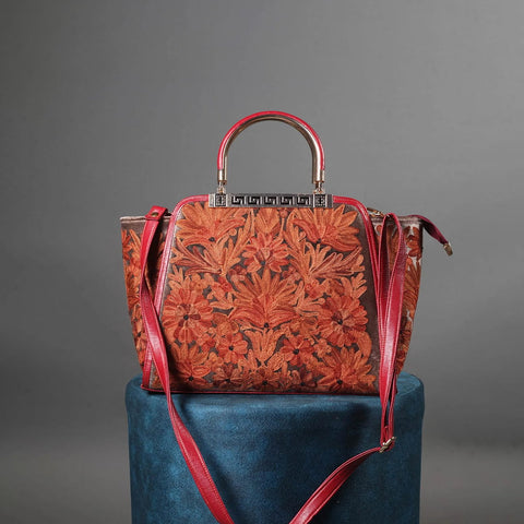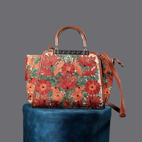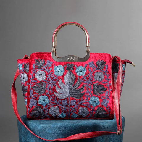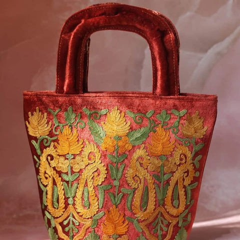 Red and Brown Poshkaar Aari Embroidered Hand Bag