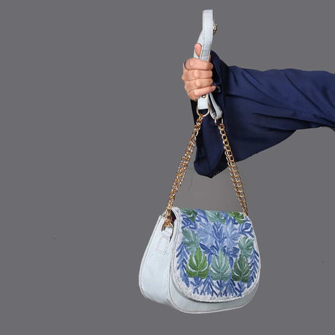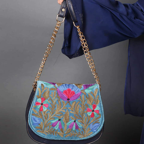 Sky Blue Aari Chinar Design Embroidered Full Flap Sling Bag