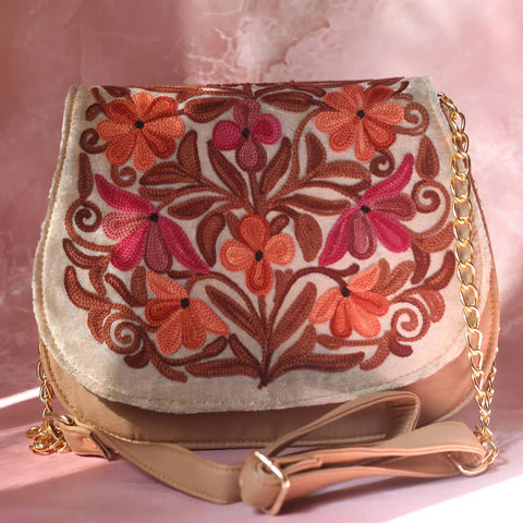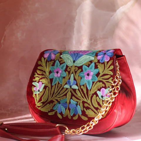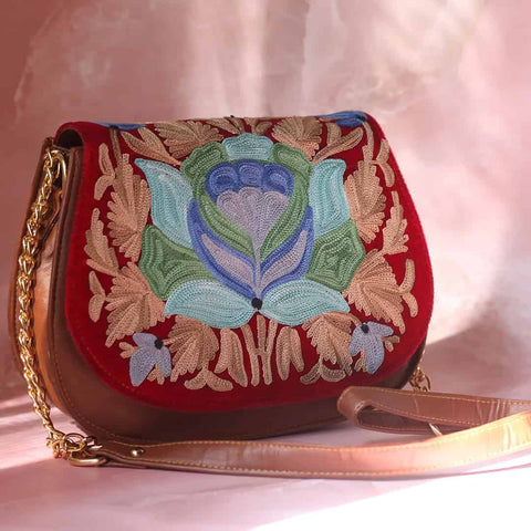 Red & Brown Aari Embroidered Full Flap Sling Bag