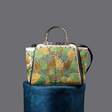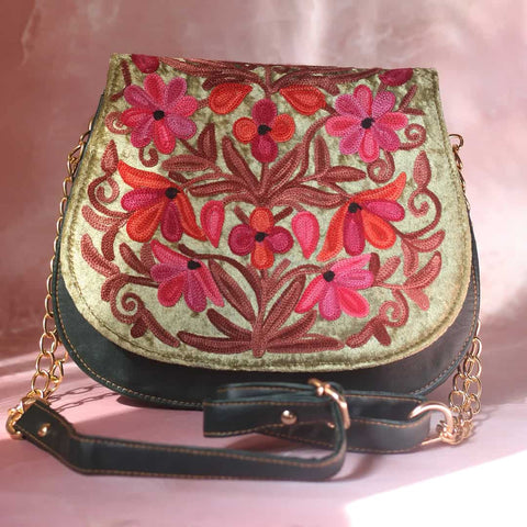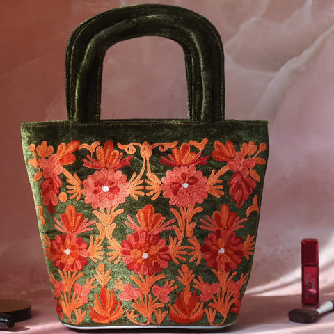 Olive Green Chinar Design Aari Embroidered Hand Bag