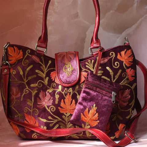 Velvet Maroon Embroidered Hand Bag With Pouch
