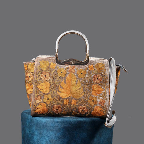 Golden Chinar Aari Embroidered Grey Hand Bag