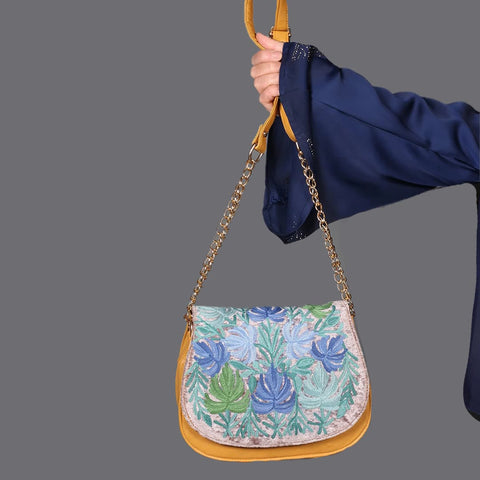 Yellow and Silver Chinar Aari Embroidered Full Flap Sling Bag