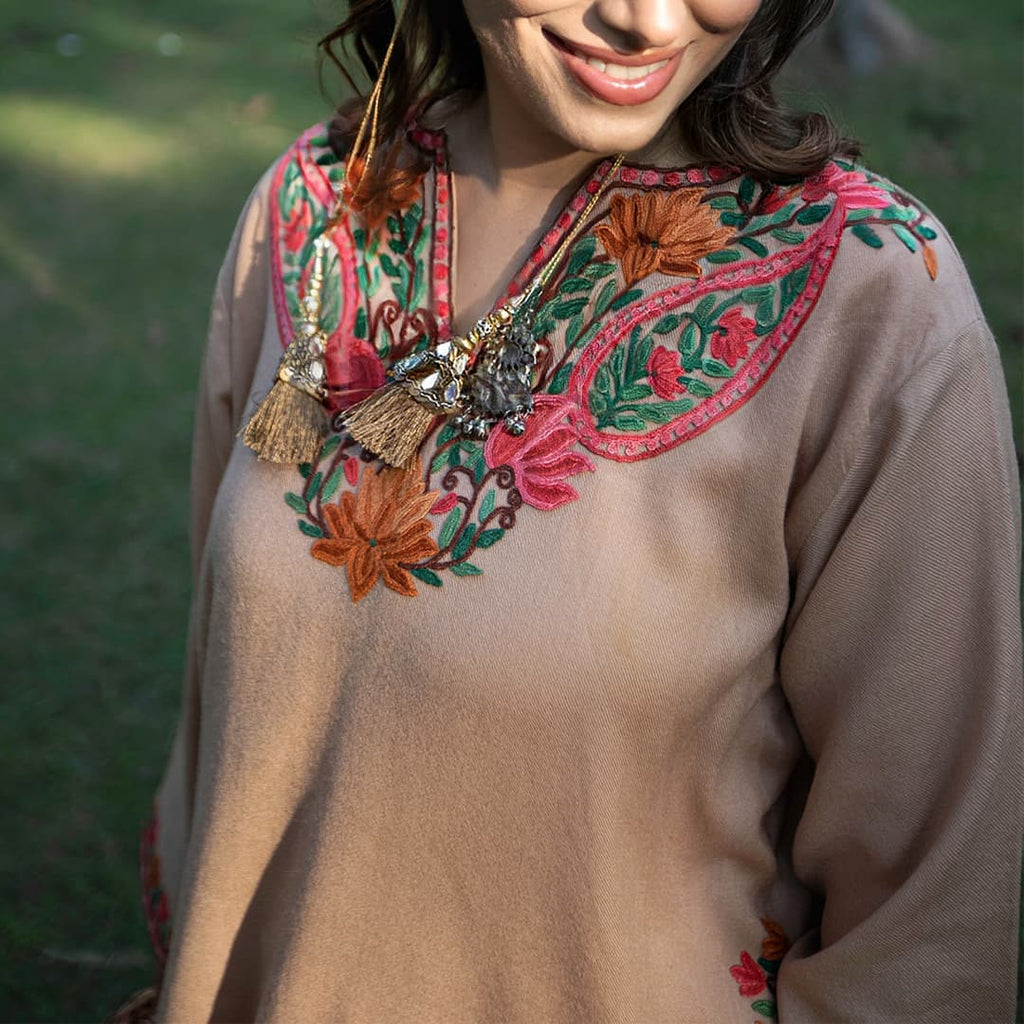 Inspired by the golden glow of falling Chinar leaves, this hand-embroidered Phiran embodies the soul of a Kashmiri autumn. Intricate paisley motifs in warm, earthy tones bloom across a soft beige canvas â a seamless blend of grace, nostalgia, and the timeless artistry of the valley.