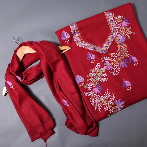 Maroon Base Aari Embroidered Unstitched Woolen Suit with Stole
