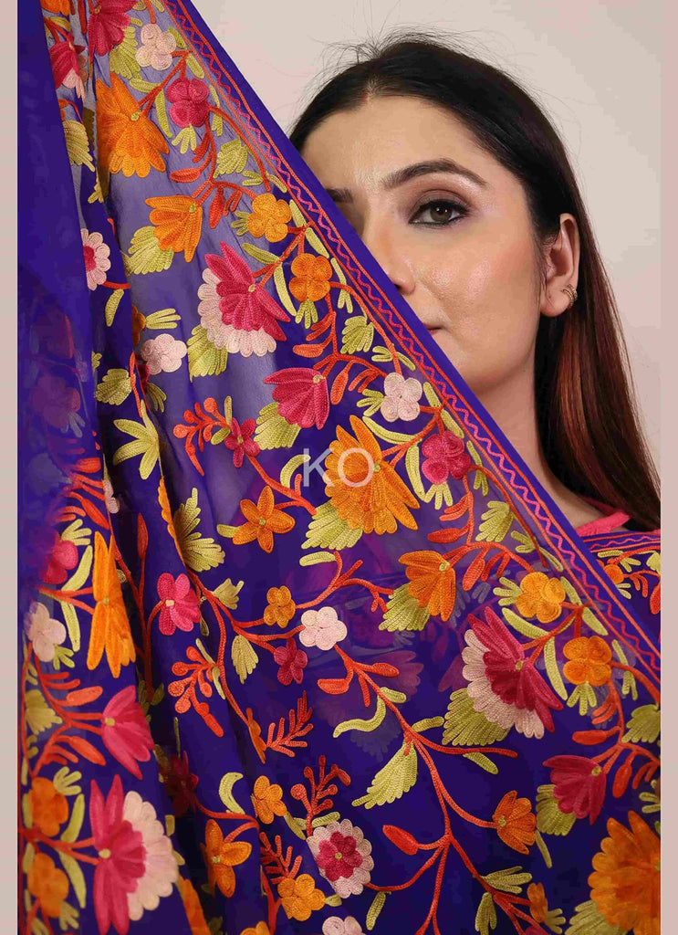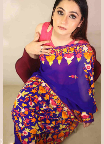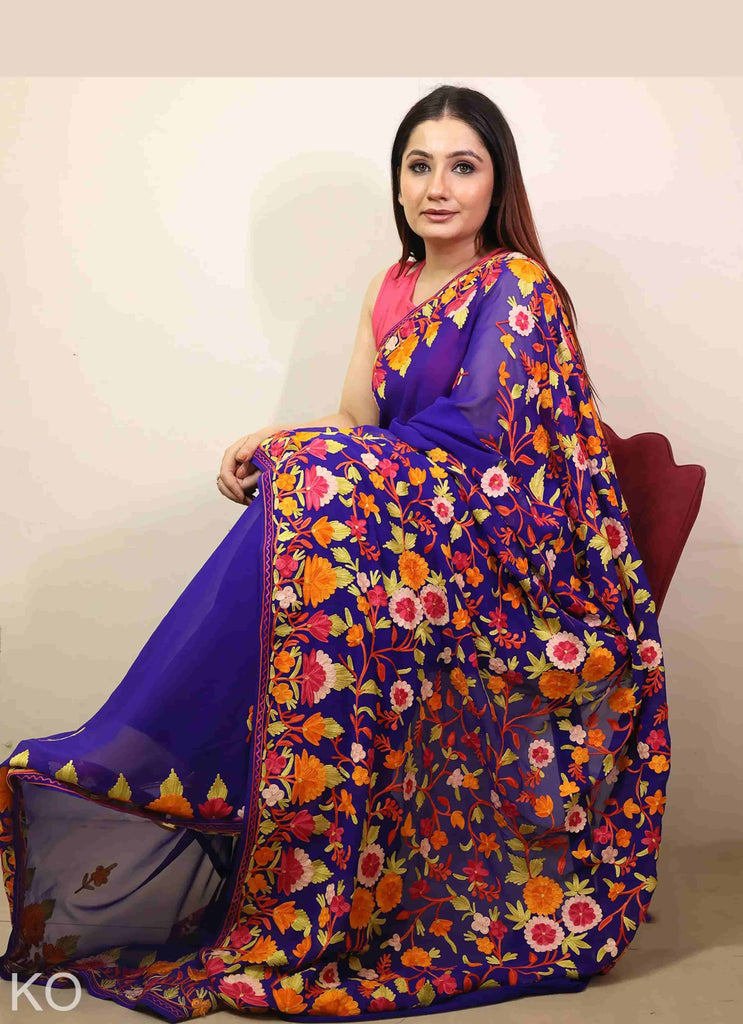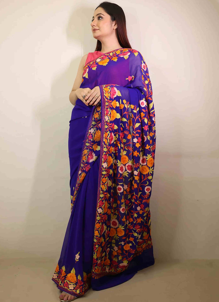 Blue Multicolour Aari Embroidered Georgette Saree