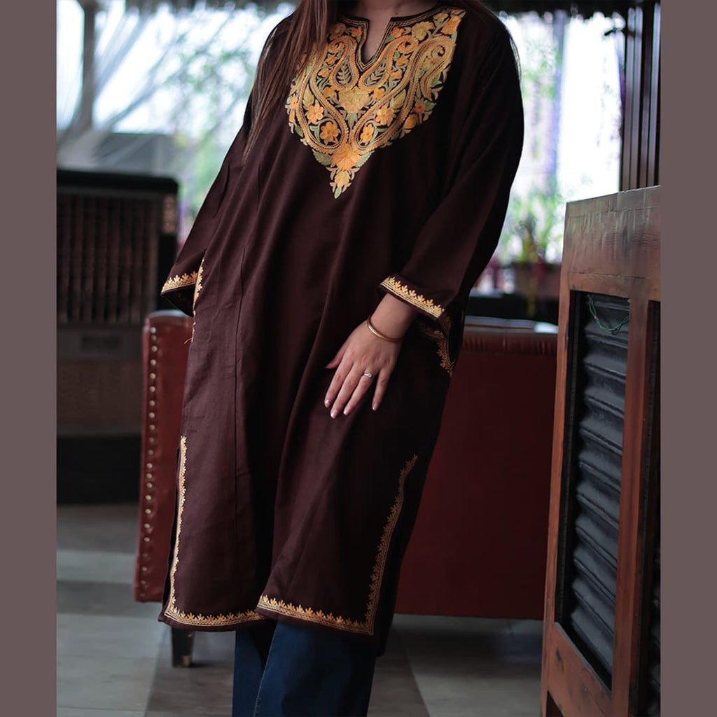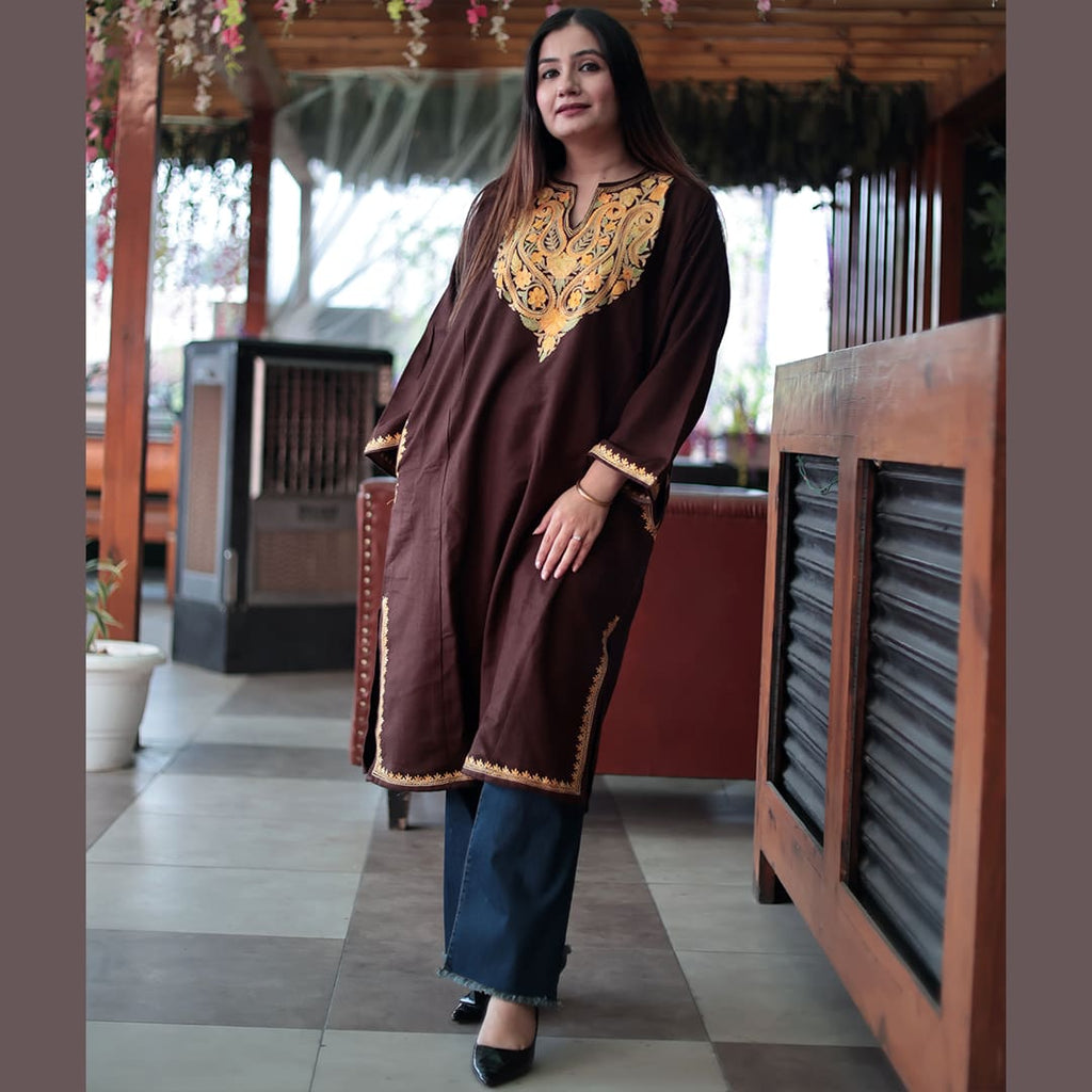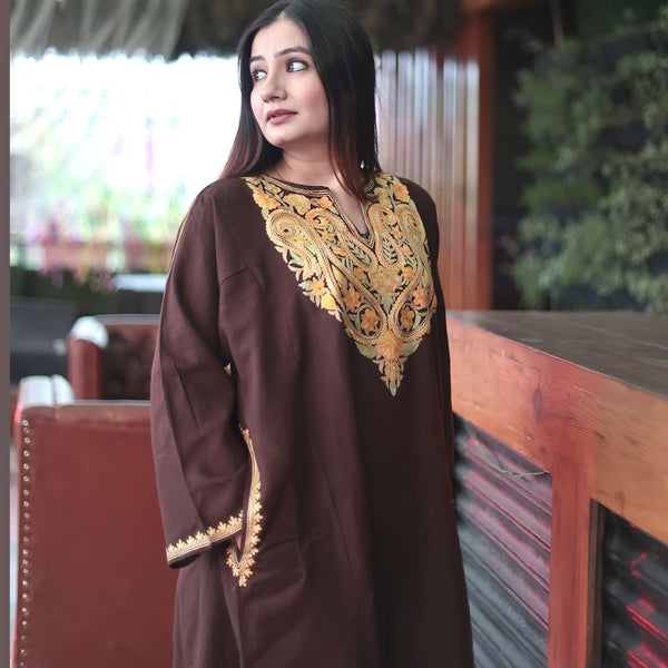 Brown Paisley Aari Embroidered Kashmiri Pheran