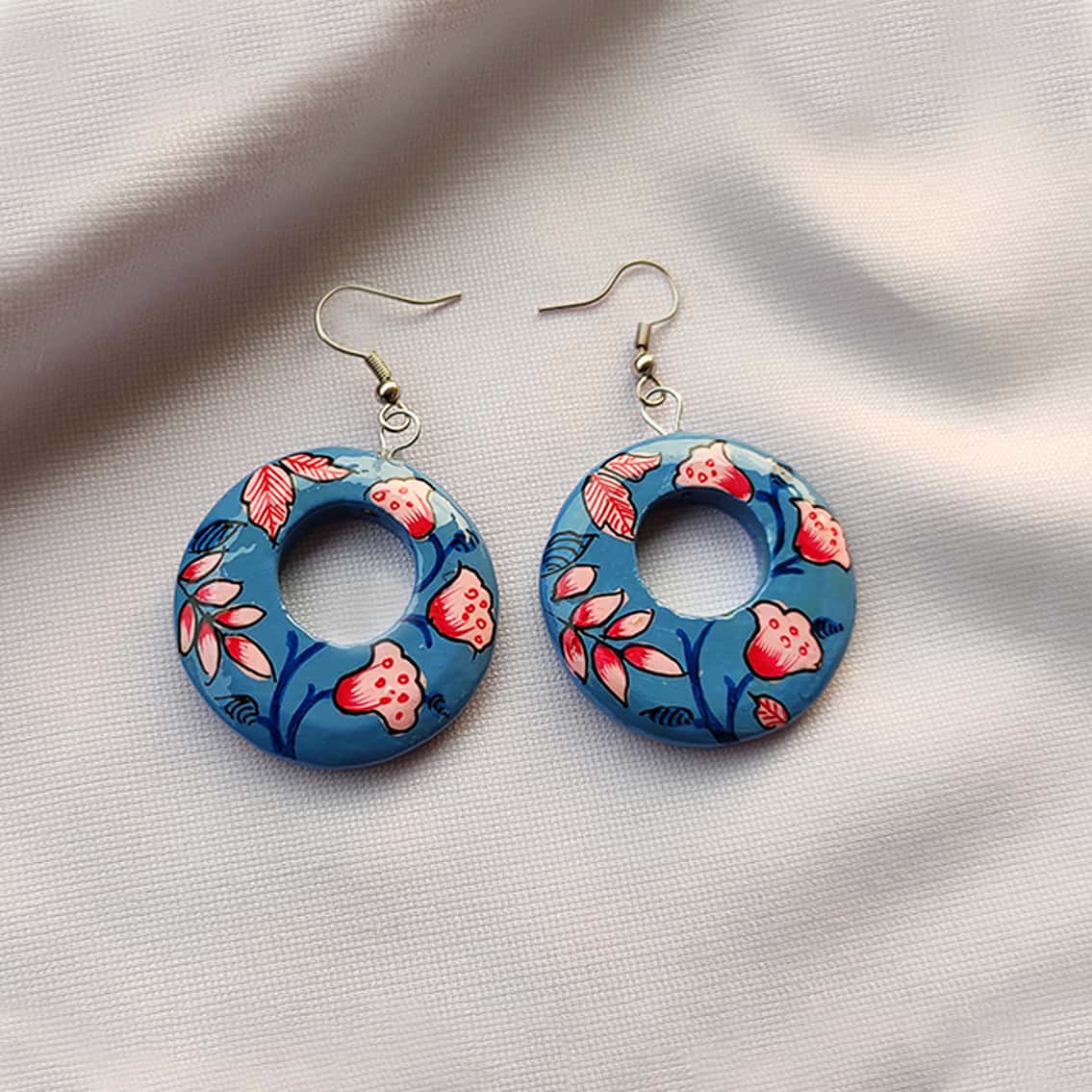 Circle Paper Mache Blue Earrings Hand Painted