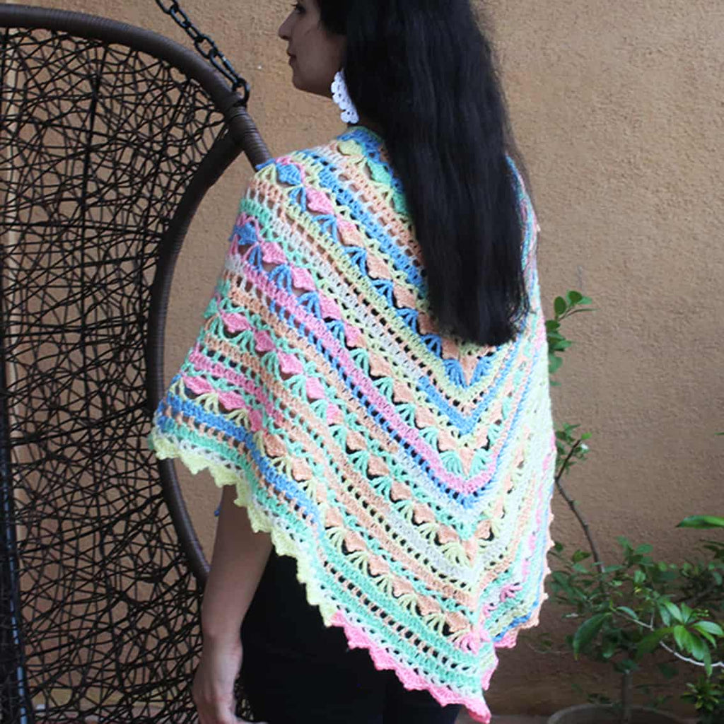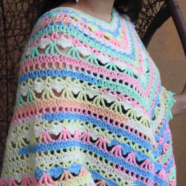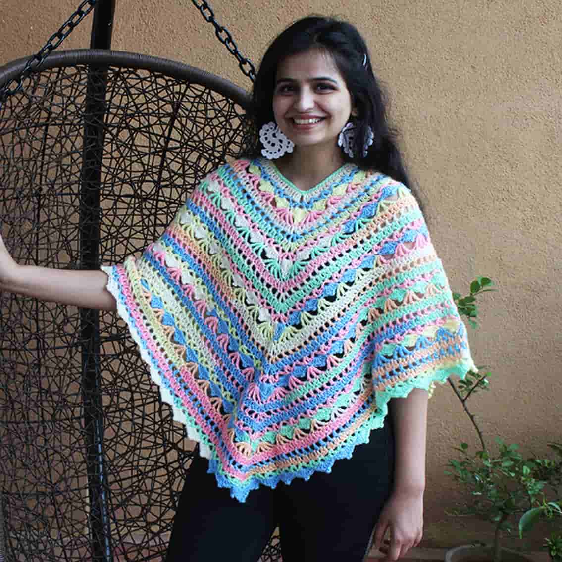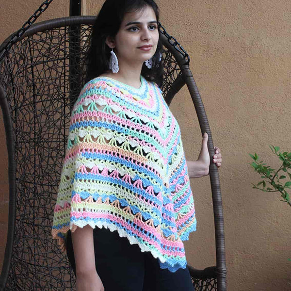 Pastel Multicolored, hand-crocheted woollen Poncho, featuring an elegant floral designed pattern all over. V-Neck, half sleeves and floral lacy border. Goes Perfectly with casual dresses, both western and ethnic. Ā