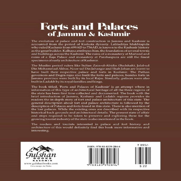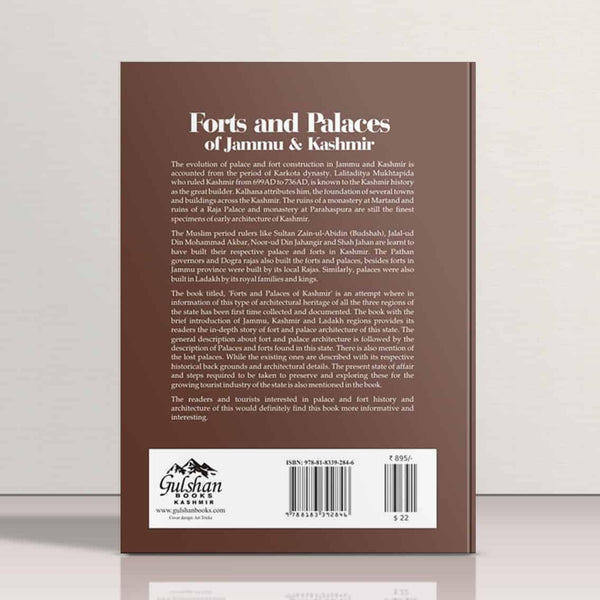 The evolution of palace and fort construction in Jammu and Kashmir is accounted for from the period of Karkota dynasty. Lalitaditya Mukhtapida who ruled Kashmir from 699AD to 736AD is known to the Kashmir history as the great builder. Kalhana attributes him, the foundation of several towns and buildings across the Kashmir. The ruins of a monastery at Martand and ruins of a Raja Palace and monastery at Parahaspura are still the finest specimens of the early architecture of Kashmir. The Muslim period rulers like Sultan Zain-ul-Abidin (Budshah), Jalal-ud Din Mohammad Akbar, Noor-ud Din Jahangir and Shah Jahan are learnt to have built their respective palace and forts in Kashmir. The Pathan governors and Dogra rajas also built the forts and palaces, besides forts in Jammu province were built by its local Rajas. Similarly, palaces were also built in Ladakh by its royal families and kings. The book titled, 'Forts and Palaces of Kashmir is an attempt wherein information of this type of architectural heritage of all the three regions of the state has been first time collected and documented.