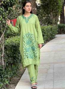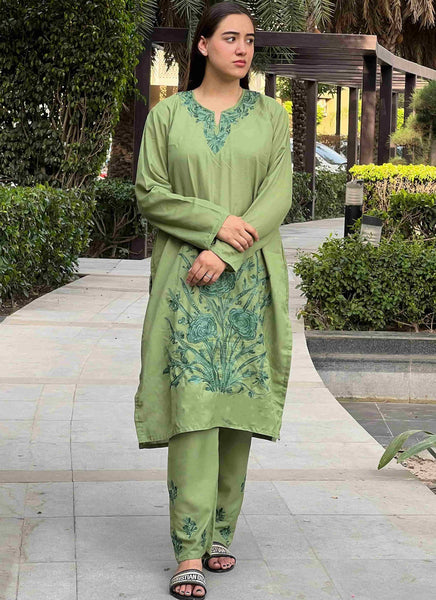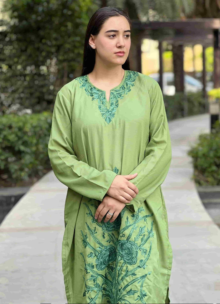 Introducing the Green Tone on Tone Kashmiri Aari Embroidered Cord Set, a luxurious full suit made from summer cool cotton for exceptional comfort in warm weather. This stunning ensemble features delicate Aari embroidery in a tone-on-tone design, enhancing the rich green fabric with intricate details that highlight the elegance of traditional Kashmiri craftsmanship.