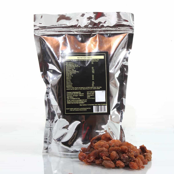 Rich in antioxidants, potassium, vitamin C  & K, grapes are full of essential nutrients. Kashmir Origin's dried brown grapes have been sun-dried in the pristine Himalayan air making them densely packed with vitamins & minerals. Good for anaemia, constipation, the skin they can be consumed year-round.