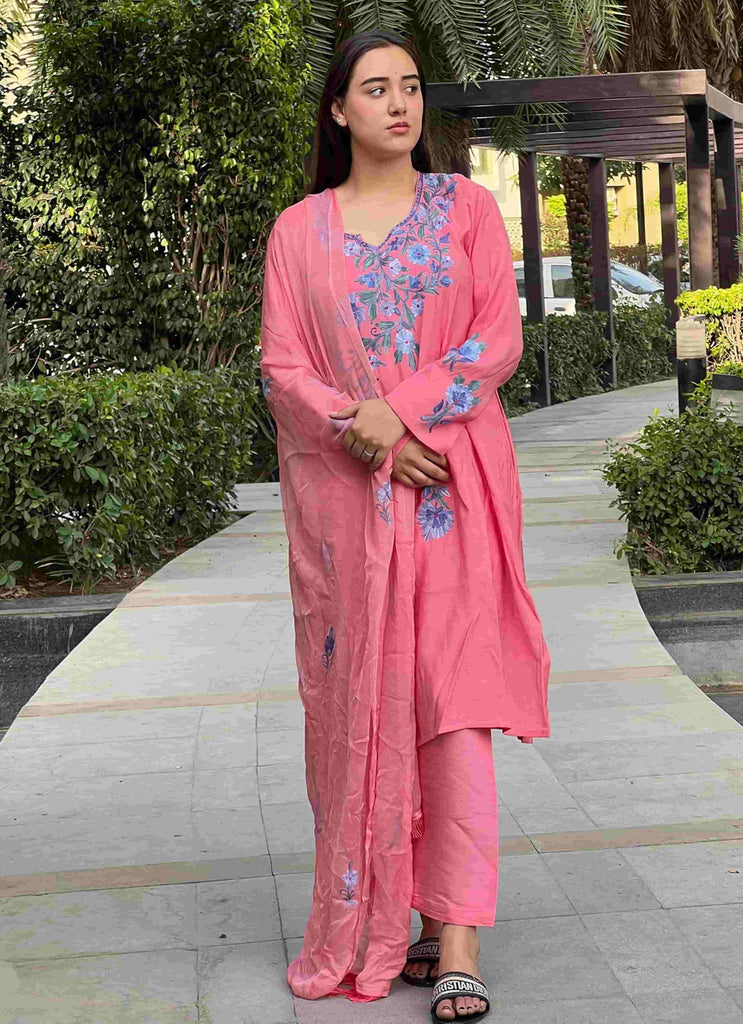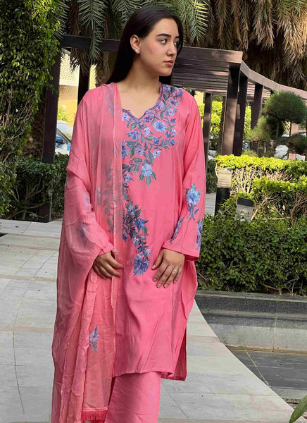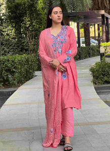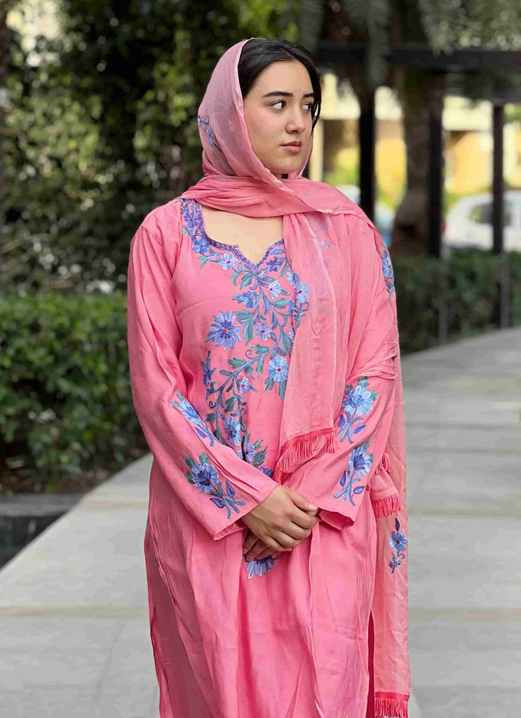 Introducing the Pink & Blue Kashmiri Aari Embroidered Silk Crepe Cord Set, an exquisite full suit crafted from luxurious silk crepe. This elegant ensemble features intricate Aari embroidery in a beautiful pink and blue design, showcasing the timeless artistry of Kashmiri craftsmanship. The set includes a matching lace dupatta, adding a touch of delicate sophistication.
