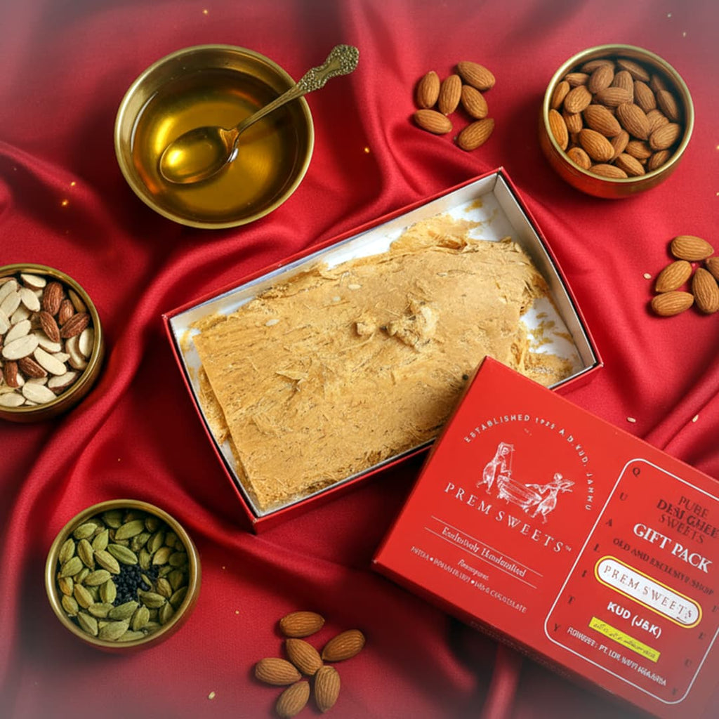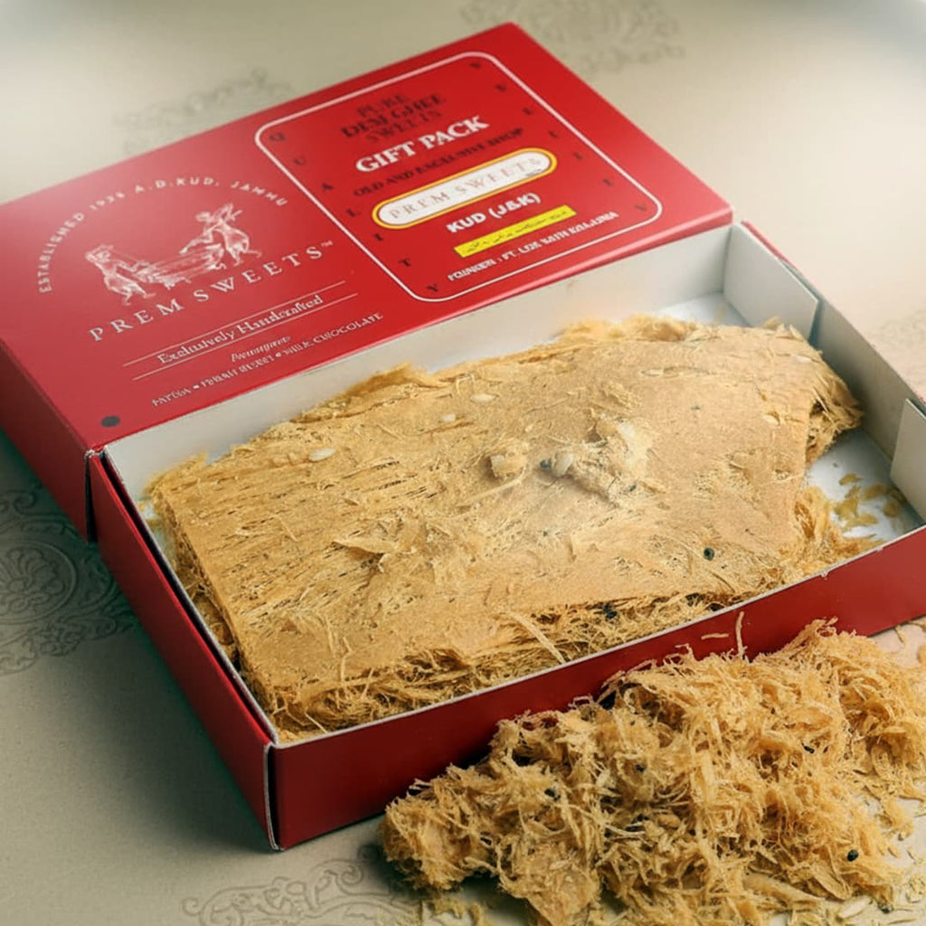 Indulge in the timeless taste of Prem Sweets Kud Patisa, a traditional sweet from the scenic hill town of Kud, near Patnitop (Jammu & Kashmir). Famous across North India, Kud Patisa is known for its crisp, flaky texture and rich aroma of pure desi ghee — a perfect blend of heritage, craftsmanship, and taste.