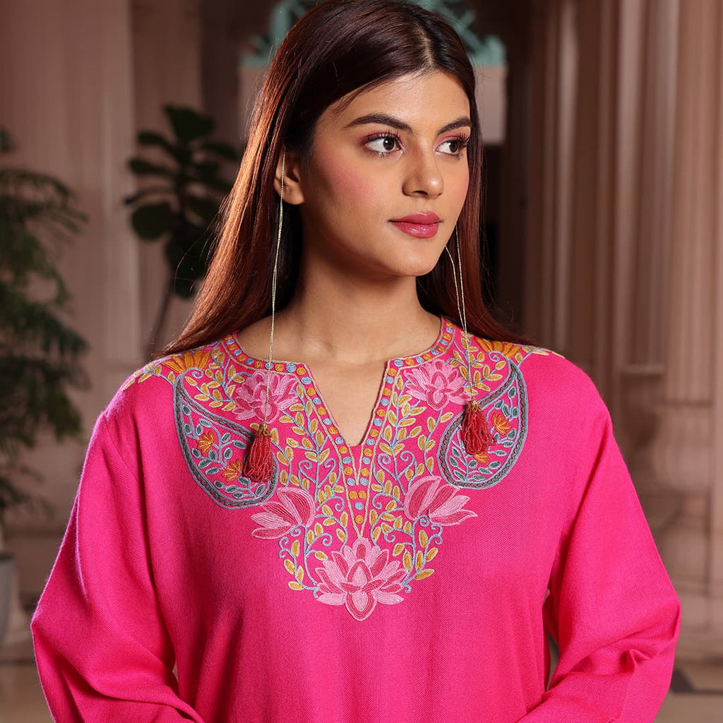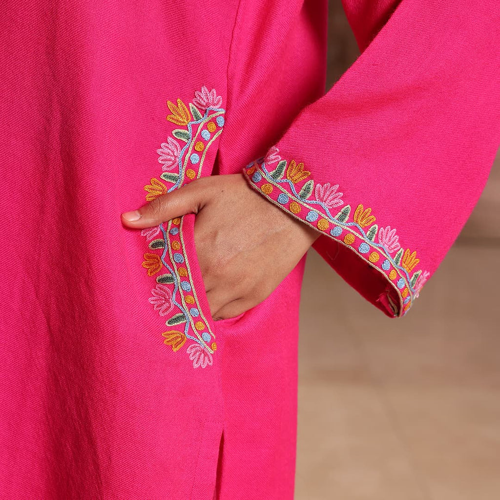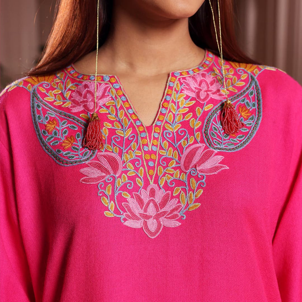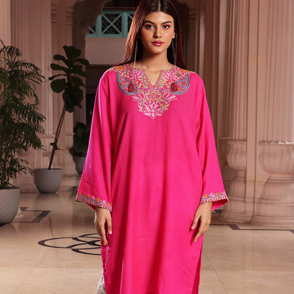 This Pheran is a testament to the rich cultural heritage of Kashmir, where the art of Kashida embroidery has been cherished for generations. Each intricate motif on this elegant rani pink Pheran is carefully hand-stitched, creating a tapestry of vibrant colors and patterns that tell a story of artistry and tradition.