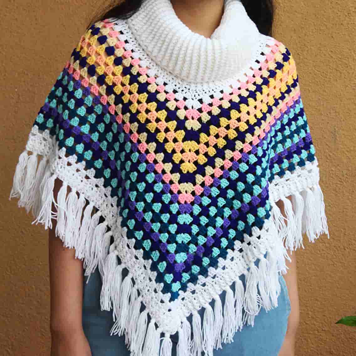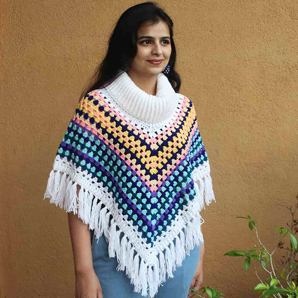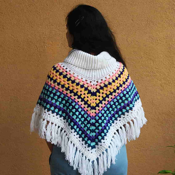 White, blue and yellow, hand-crocheted woollen Poncho, featuring a Ripple designed pattern. Cowl Neck, short sleeves, and lush white tasselled border. Perfect for evening outings and cosy mornings. Ā