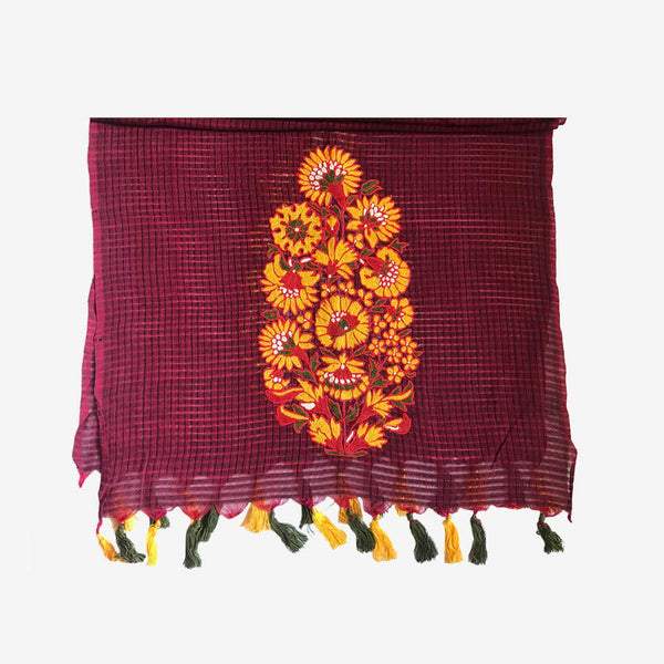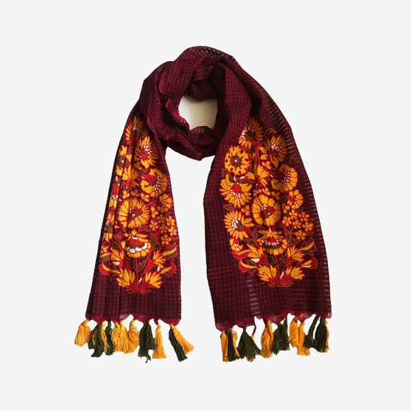 Tasselled Maroon Colored Summer Stole In Traditional Buta Pattern