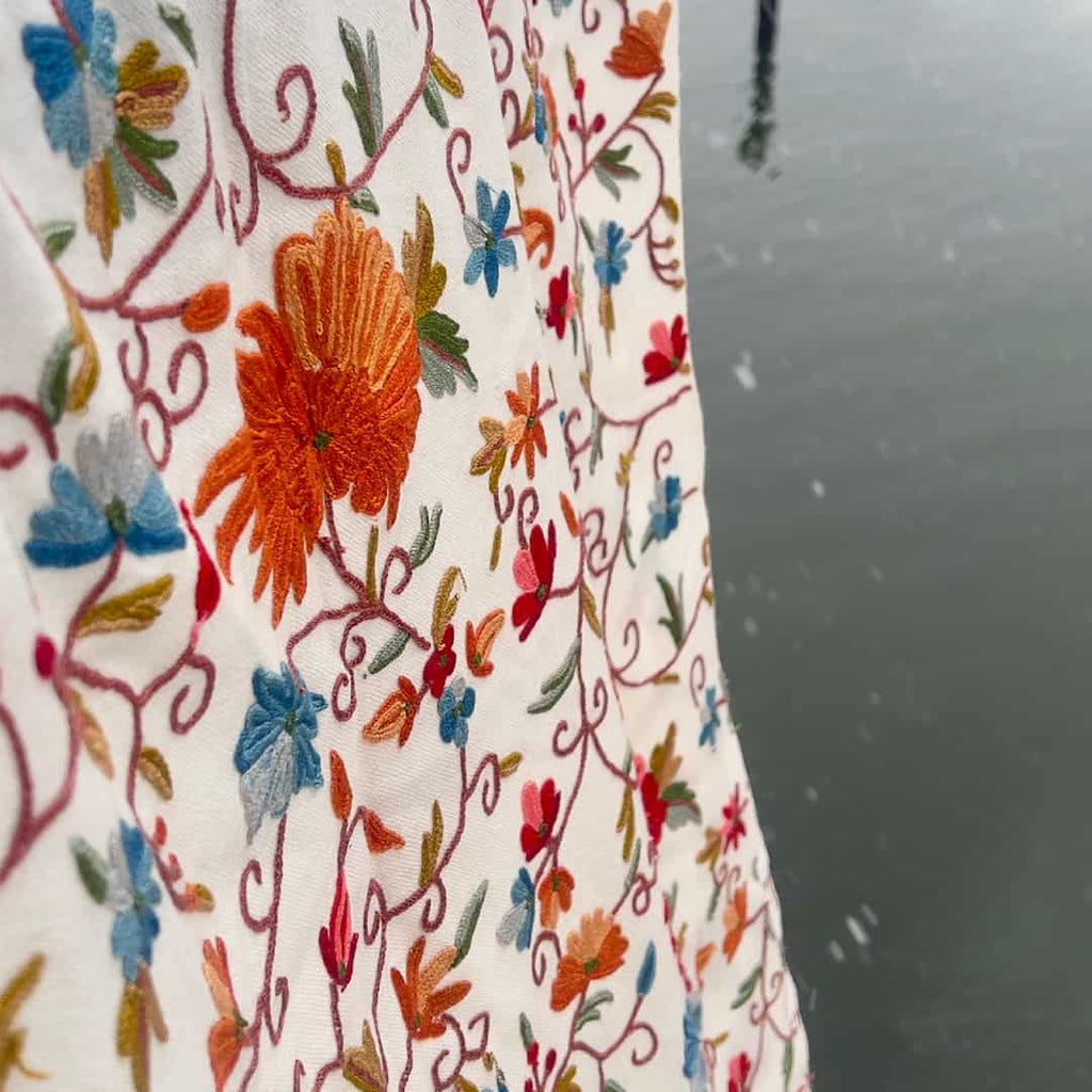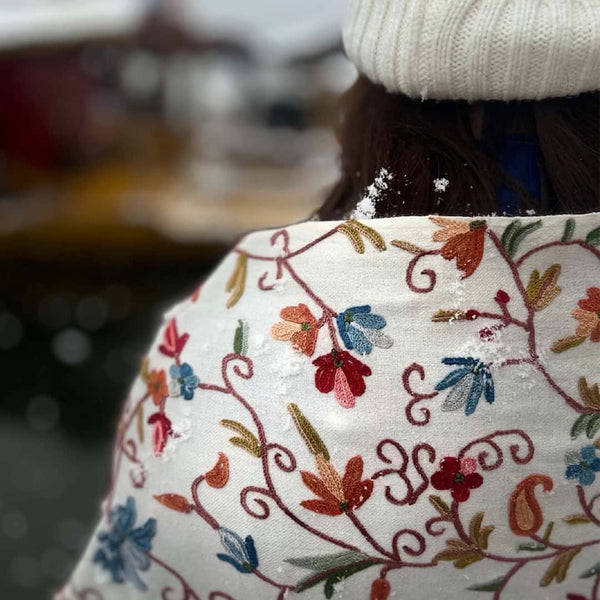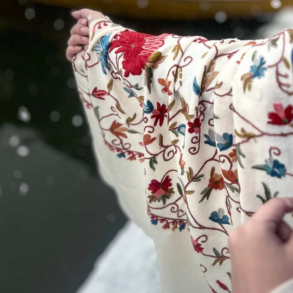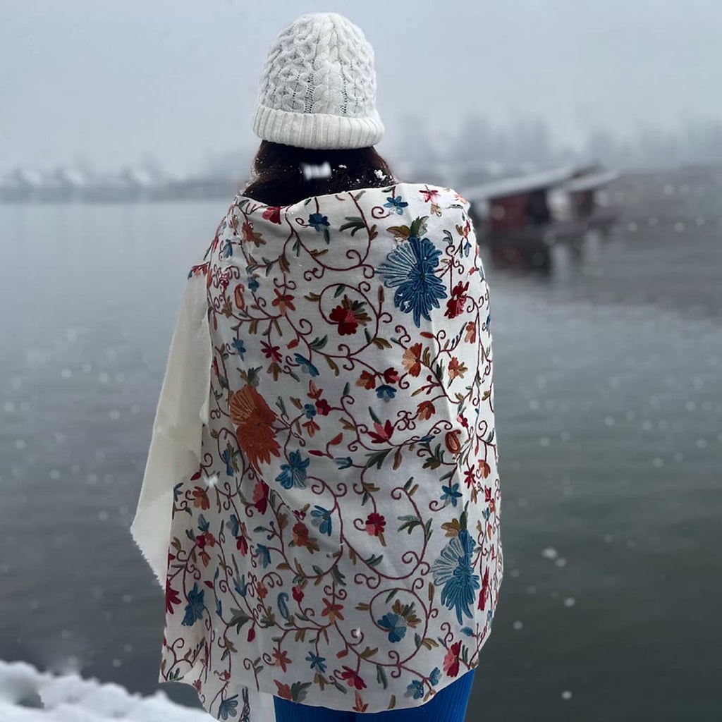 Introducing the White Colored Winter Stole in Kashmiri Hand Embroidery, the perfect accessory to keep you warm and stylish this winter season. This luxurious stole is crafted from high-quality wool and features intricate Kashmiri hand embroidery, creating a unique and elegant design that is sure to make a statement. The bright white color adds a touch of sophistication, making it the perfect addition to any outfit. Soft and cozy, it will keep you warm and comfortable on the coldest of days. With its beautiful craftsmanship and timeless design, this stole is the ultimate in winter luxury. Treat yourself to the ultimate in style and comfort with this exquisite White Colored Winter Stole in Kashmiri Hand Embroidery.