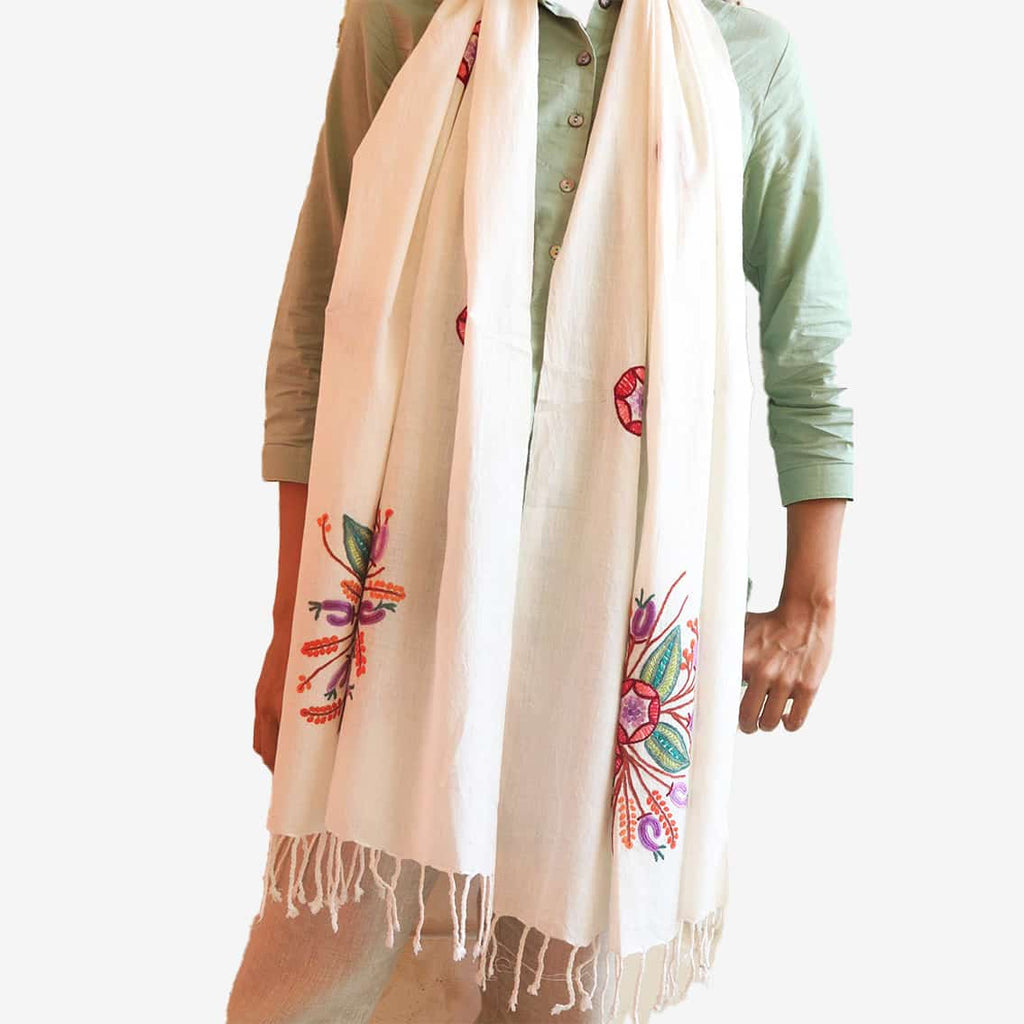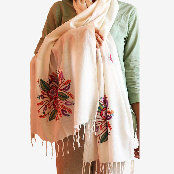 White Colored Paldaar Ring Patterned Embroidered Stole